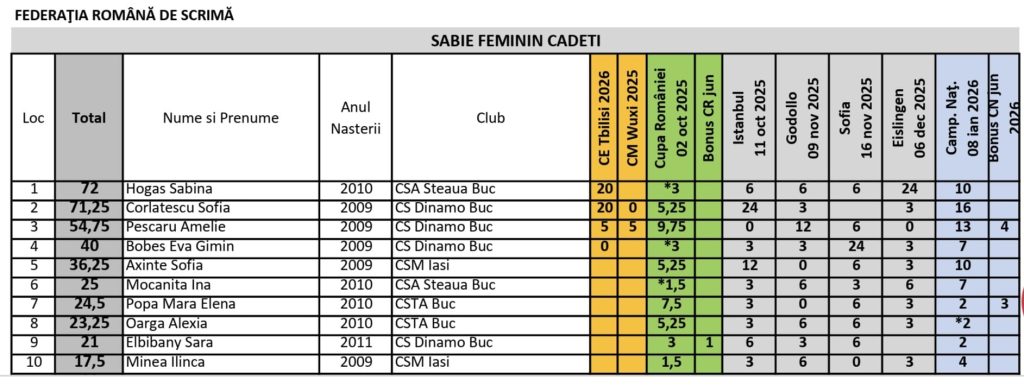 Astăzi, acest traseu are și o validare concretă: în clasamentul oficial al Federației Române de Scrimă, actualizat la 2 martie 2026, Sabina Andreia Hogaș ocupă locul 1 la sabie feminin cadeți, cu 72 de puncte, în fața principalelor sale rivale din generația actuală.